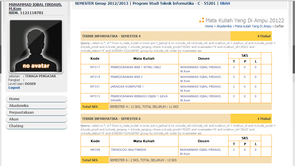 1. Pilih menu Akademika >> Mata Kuliah yang diampu dosen