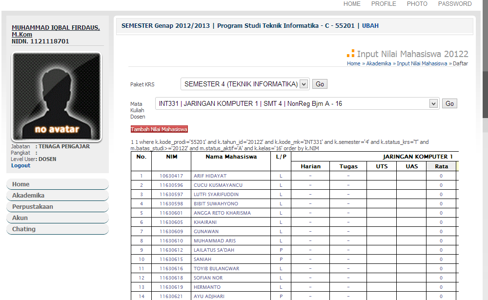 1. Pilih menu Akademika >> "Input Nilai Mahasiswa" untuk memasukkan nilai Mahasiswa