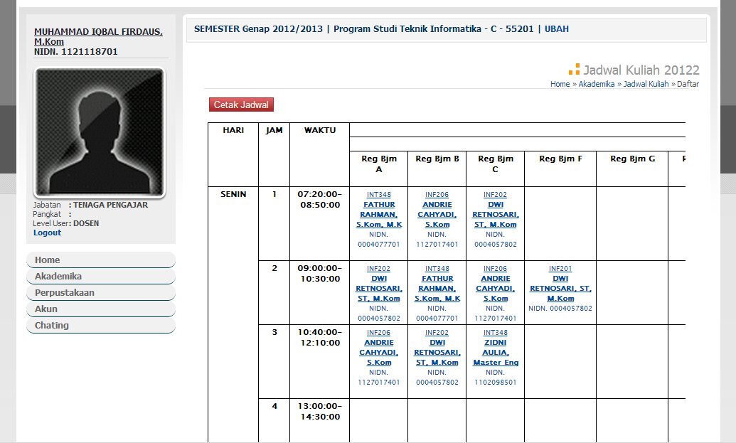 1. Pilih menu Akademika >> Jadwal untuk melihat jadwal pribadi dosen