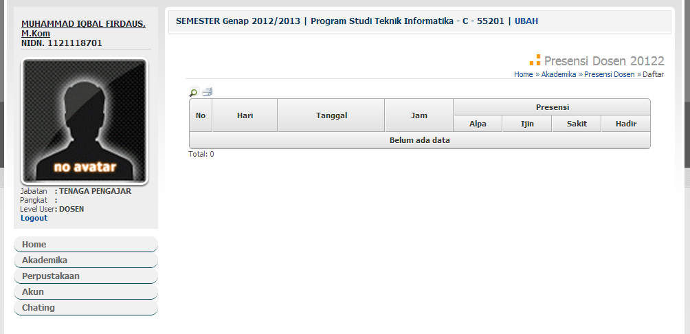 1. Pilih menu Akademika >> "Lihat Presensi Dosen" untuk memasukkan presensi dosen